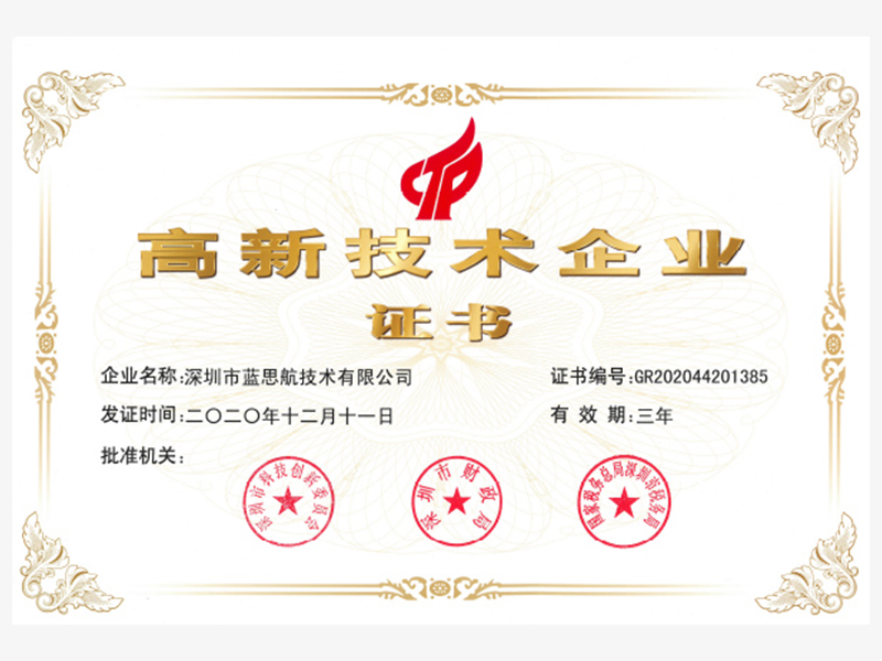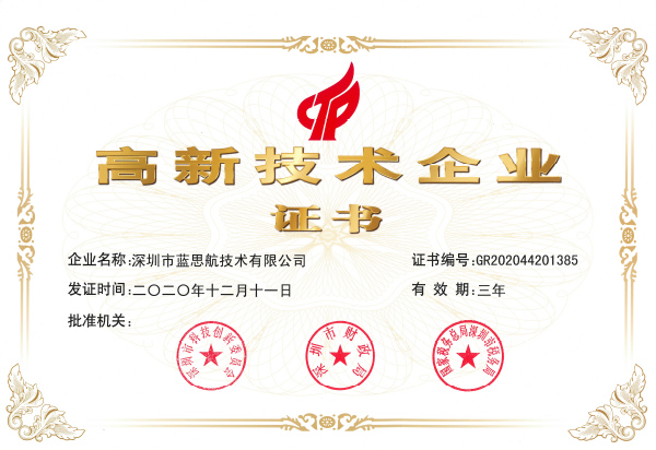 蓝思航于近期收到深圳市科技创新委员会、深圳市财政局、国家税务局深圳市税务局联合颁发的《高新技术企业证书》(证书编号:GR202044201385),发证时间:二〇二〇年十二月十一日,有效期:三年