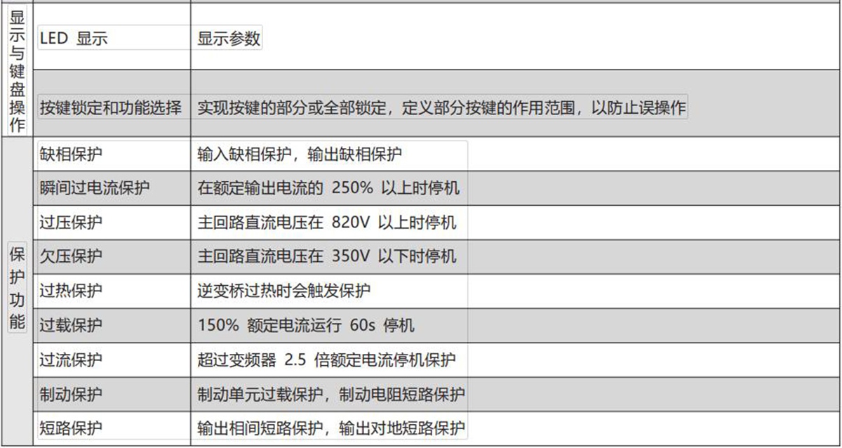 | 保护功能 | 缺相保护 | 输入缺相保护,输出缺相保护 |