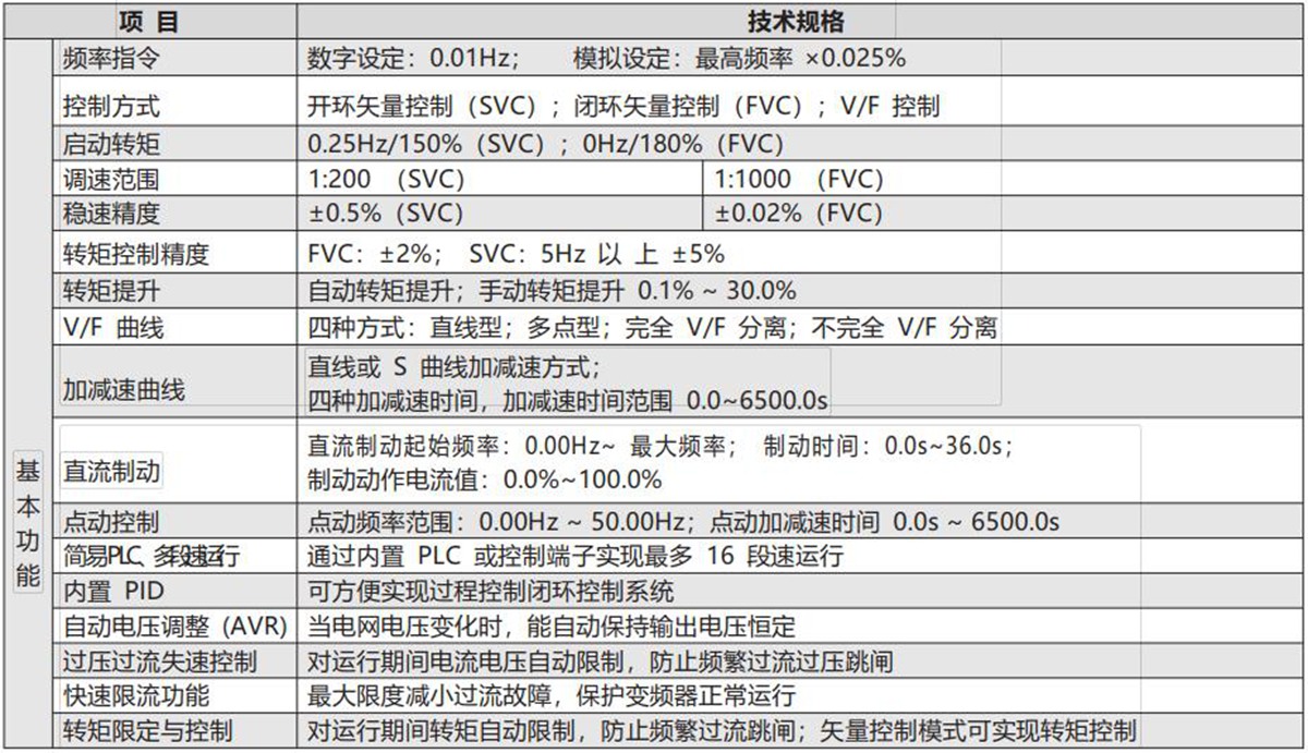 | 基本功能 | 频率指令 | 数字设定:0.01Hz;模拟设定:最高频率×0.025% |