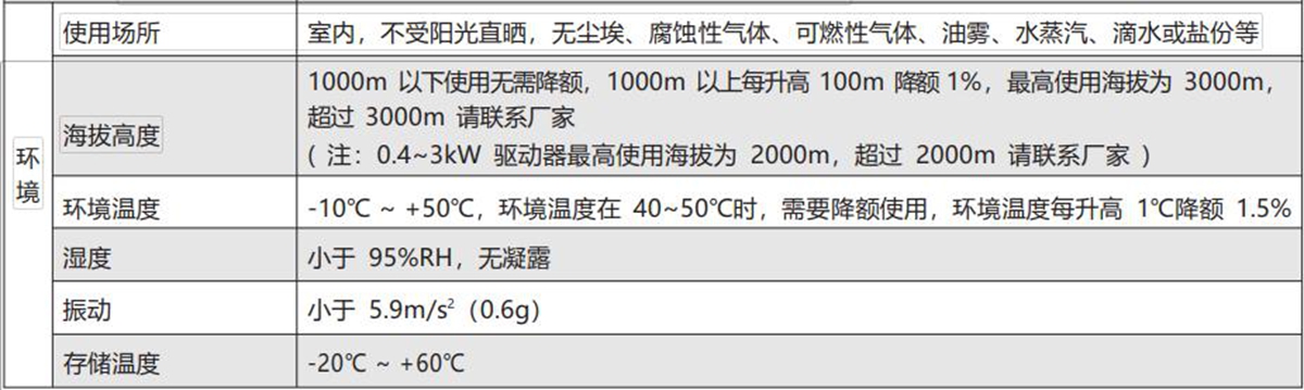 | 海拔高度 | 1000m 以下使用无需降额,1000m 以上每升高 100m 降额 1%,最高使用海拔为 3000m ( 注:0.4~3kW 驱动器最高使用海拔为 2000m,如需使用到海拔 2000m 以上请联系厂家 ) | |